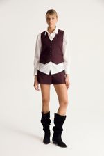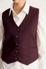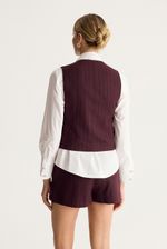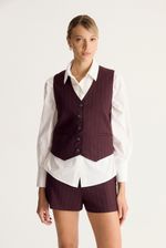 Chaleco tizado, con botónes en frente pinzas y bolsillos . Largo modular a la primera cadera