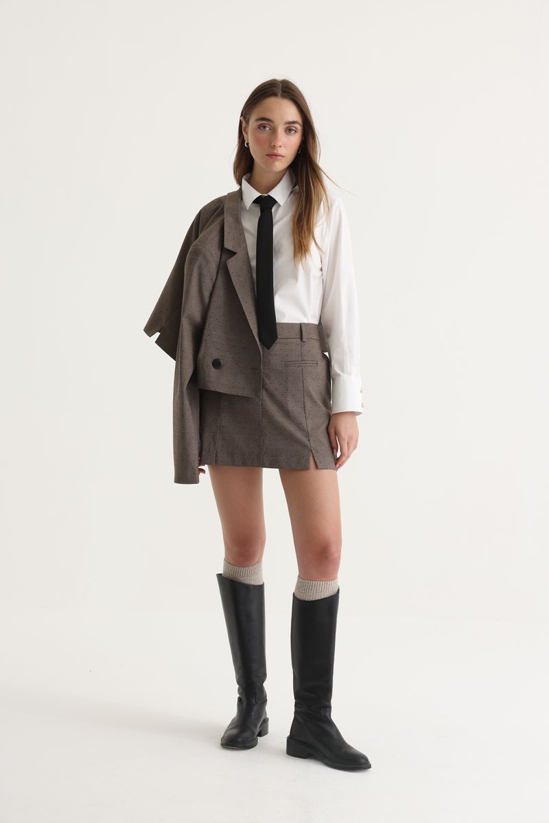 Pollera corta sastrera de principe de gales con pequeñas tachitas negras. Lleva cintura con gancho sastrero interno y cartera con cierre. Bolsillos sobre lateral y tajitos en ruedo.