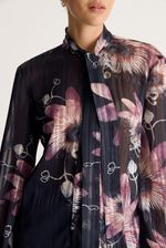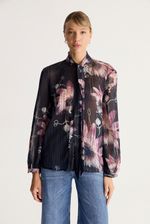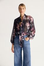 Camisa confeccionada en jacquard con lurex estampado,de calce regular con cartera y lazo para atar en frente.tiene manga con frunce y puño.