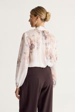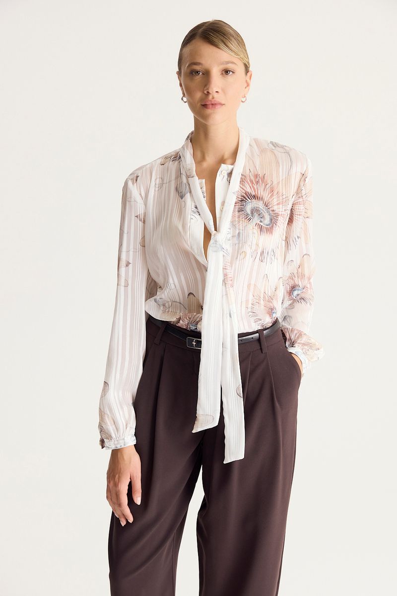 Camisa confeccionada en jacquard con lurex estampado,de calce regular con cartera y lazo para atar en frente.tiene manga con frunce y puño.