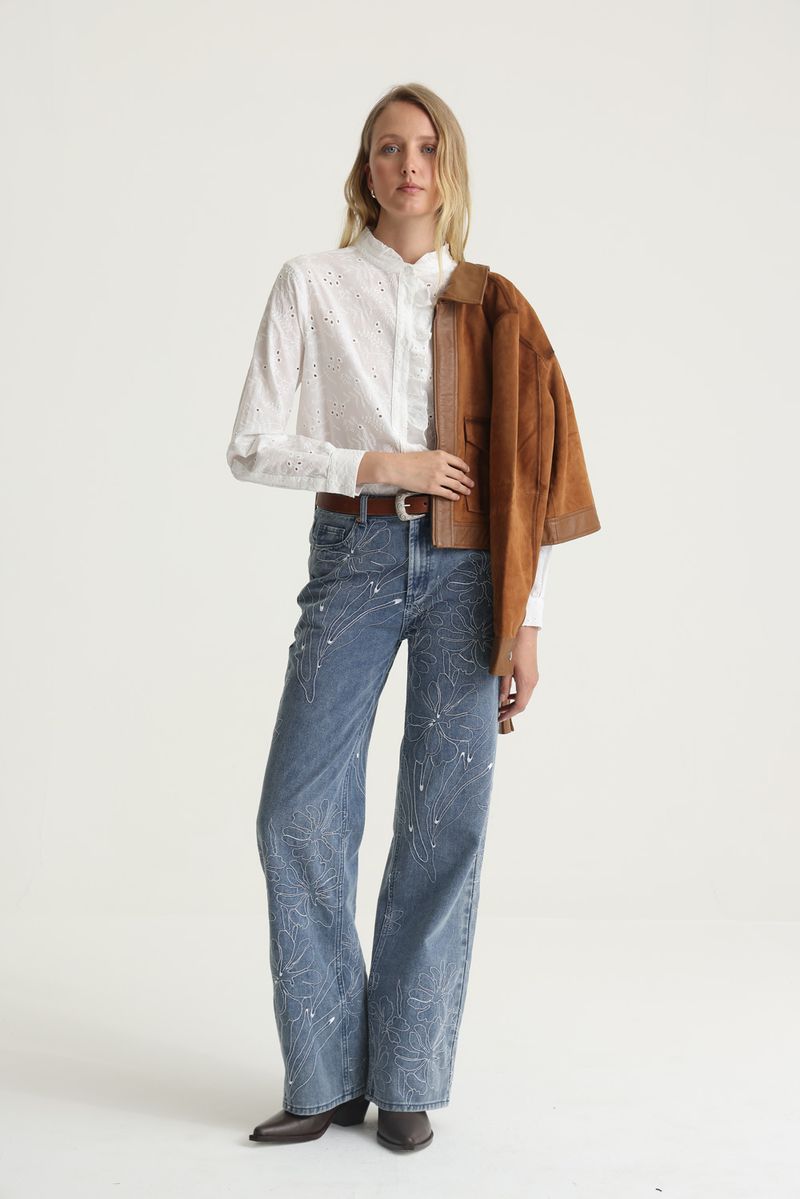 Camisa confeccionada en broderie de algodón,con cuello a la base redondo con volado.tiene cartera central para un fácil acceso y mangas balloon con frunce y puño con gota.