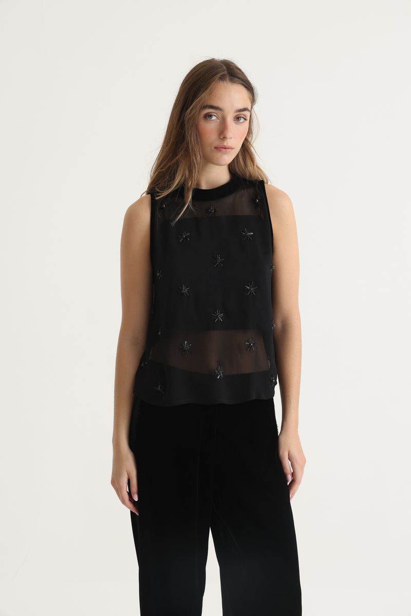 Top confeccionado en gasa con cuello y gota de espalda con velvet.tiene estrellas bordadas en toda la prenda.posee un top interno cómo forrería.