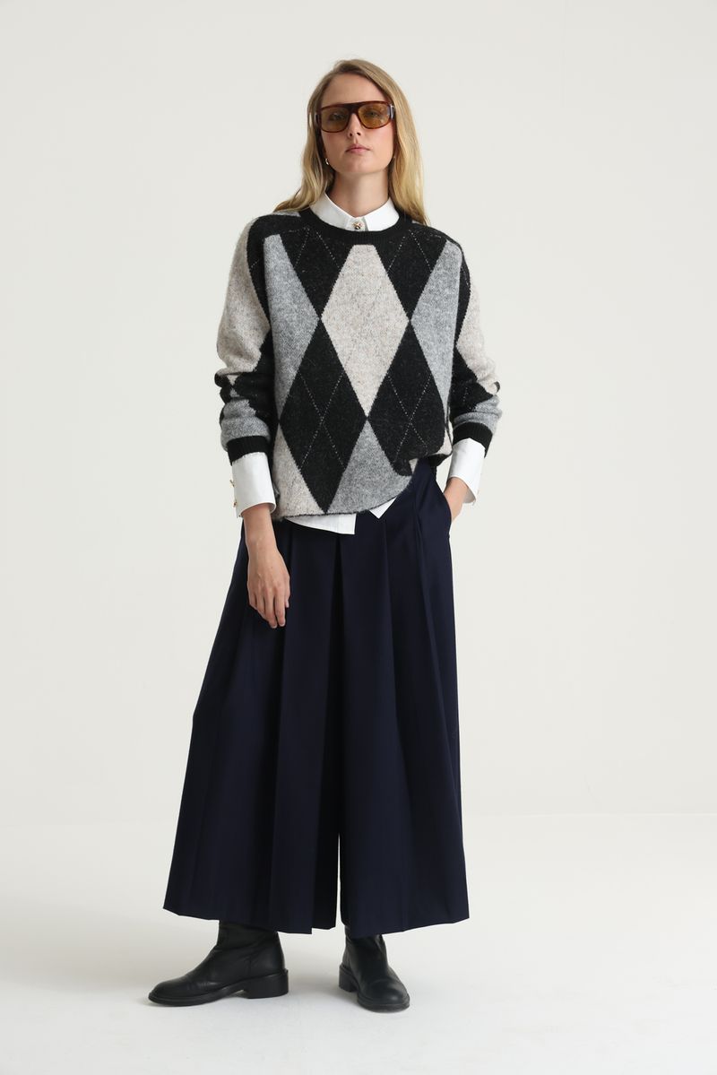 Pantalón tipo bermuda con tablas que da sansacion de pollera por su amplitud. Largo midi, bolsillos en latera, cierre en lateral y lazo en cintura con hebillas color niquel
