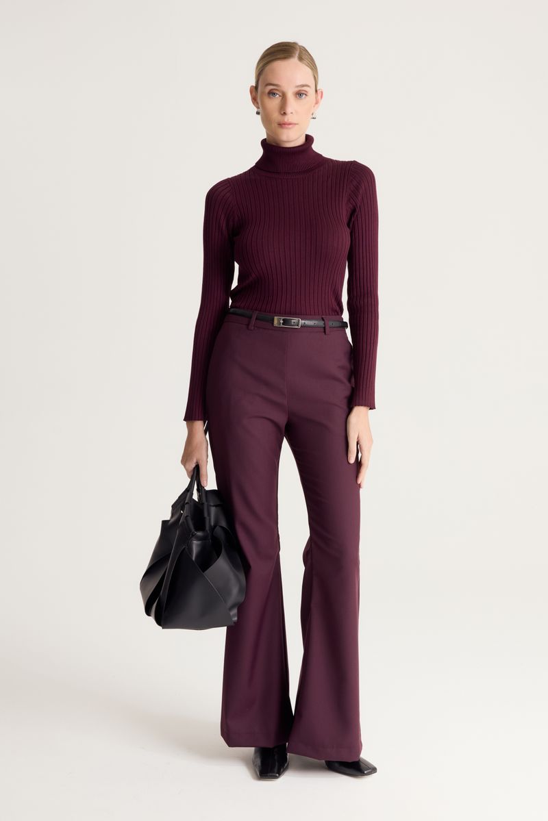 Pantalón flare tiro alto tipo twill con cierre lateral y cintura alta. Bolsillo sastrero en espalda.