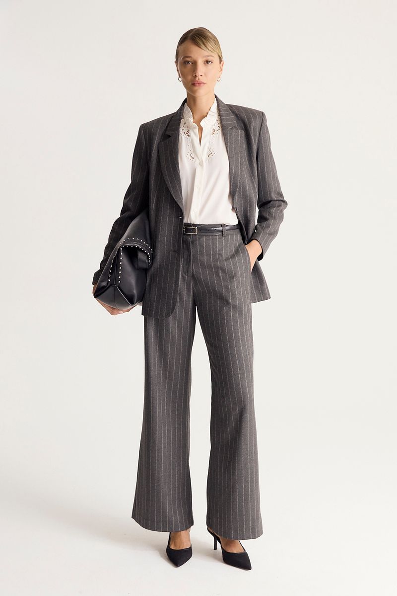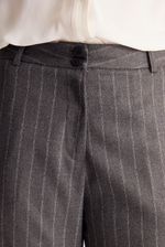 Pantalón tizado, con doble raya pespunteada exclusiva de la colección. Lleva dos botónes en cintitay bolsillos sobre lateral. Pierna tipo flare