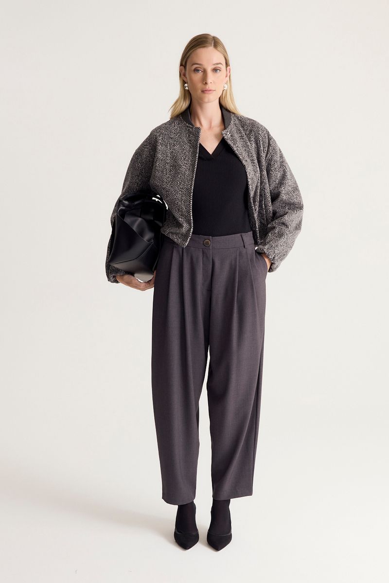 Pantalón sastrero con pinzas en frente y silueta tipo baggy, mas angosto en el ruedo. Lleva bolsillos en lateral y botón en cintura