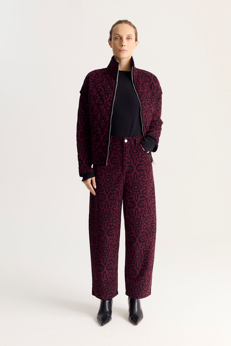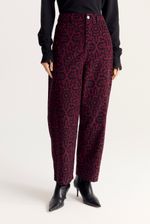 Pantalón de calce tipo baggy, realizado en corderoy estampado con dibujo desarrollado exclusivamente para esta colección. Tiro alto y pierna bien ancha con los tobillos algo más estrechos. Total look con campera corderoy boho