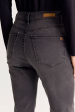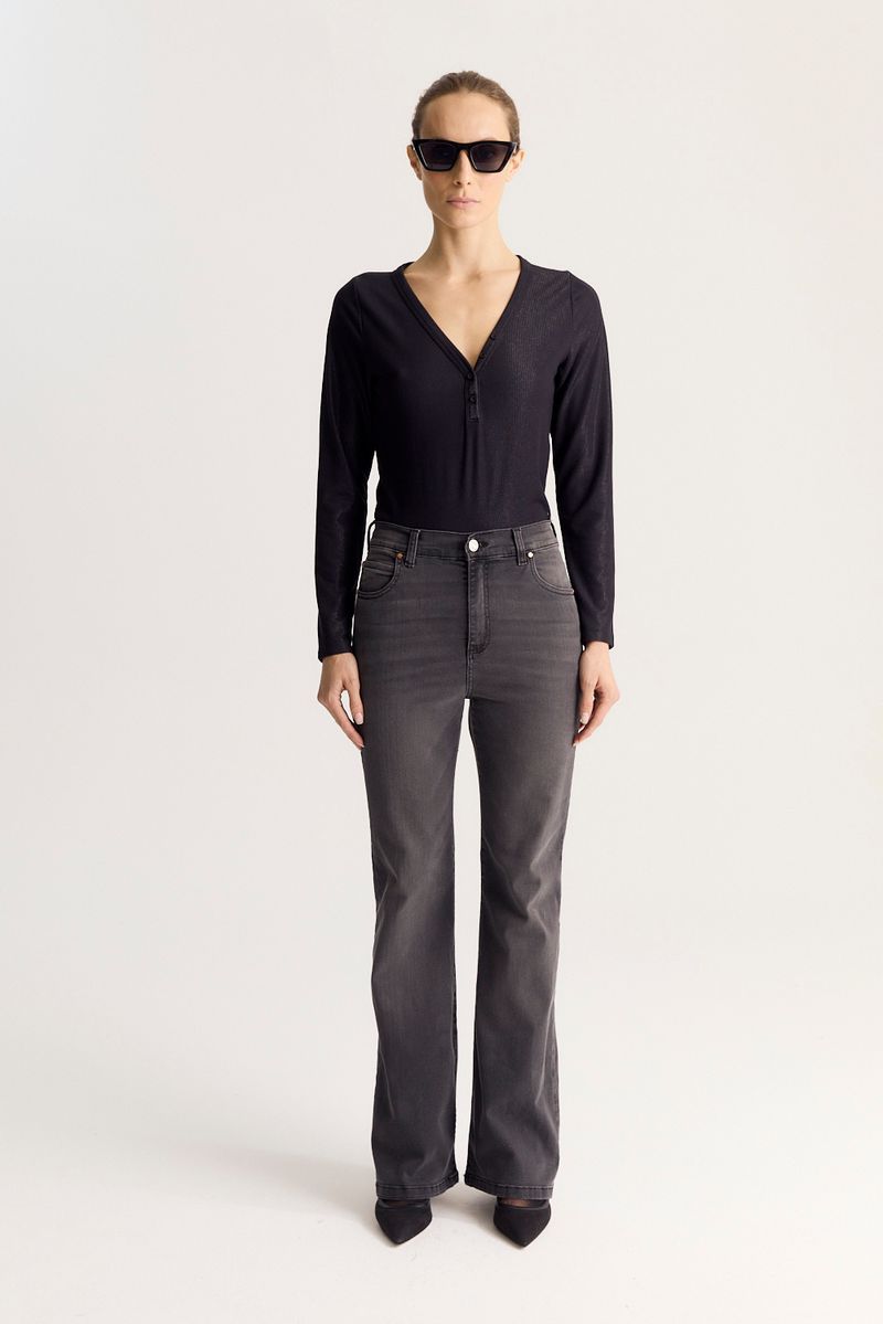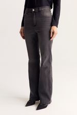 Jean de tiro alto con silueta algo ajustada y pierna bootcut ancha. Es bien largo y está realizado en un textil con confort para mayor comodidad