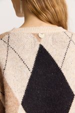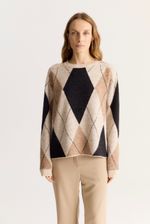 Sweater tejido jacquard con motivo de rombos,de calce holgado y escote redondo a la base. Tiene un porcentaje de poliester reciclado y lana en su composición.