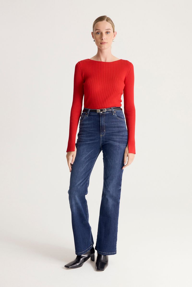 Sweater tejido de morley con escote bote y calce ajustado. Tiene tajos en los puños de las mangas