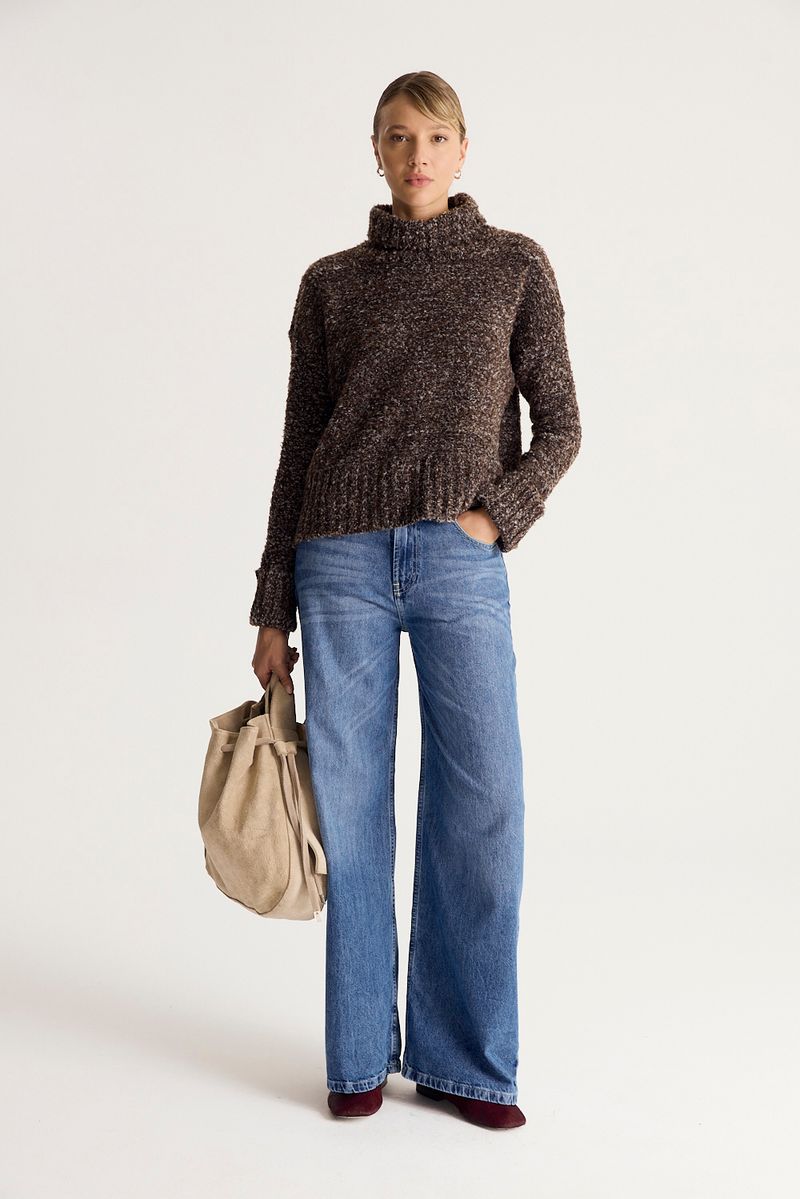 Sweater tejido con cuello polera con hilado boucle.tiene calce holgado