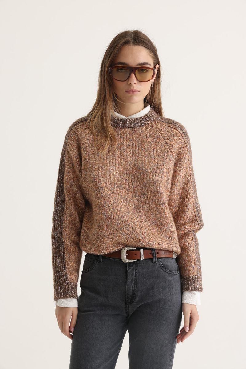 Sweater tejido con hilado combinado,de calce regular con cuello redondo a la base.tiene recorte en manga con cambio de color.