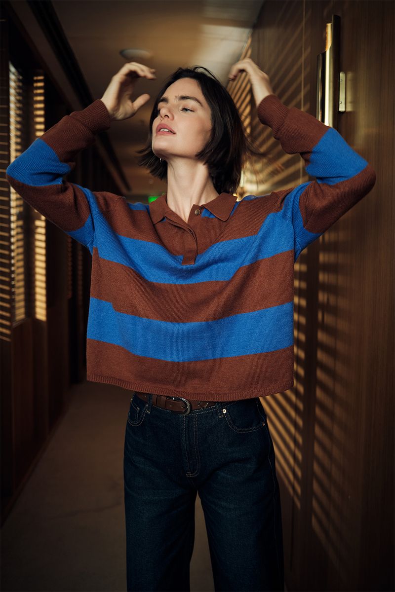 Sweater tejido rayado con cuello polo y cartera con botones en el frente.tiene manga larga recta y calce regular.