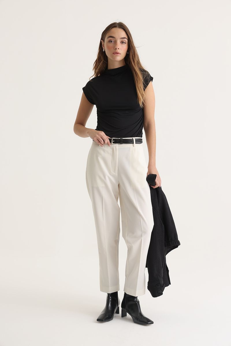 Remera de calce ajustado con escote alto, sin mangas y detalle de frunces laterales confeccionada en tejido de punto con caida