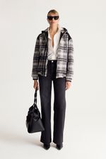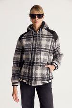 Campera de calce relajado con cierre central, capucha y bolsillos frontales. Confeccionada en tejido de punto boucle con estampado a cuadros y recortes en color combinación en suede es una opción abrigada y casual para completar el outfit